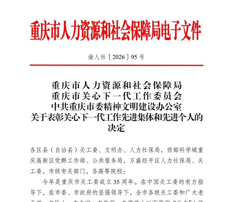 近日,学校新闻传媒学院关工委获评“重庆市关心下一代工作先进集体”,这既是对该学院关工委长期以来深耕青少年育人工作的高度肯定,也为学校关工委推进二级学院(部)基层“五好”关工委建设树立了鲜明标杆,更生动彰显了学校关工委统筹引领、精准赋能二级学院(部)关工委工作的扎实成效。长期以来,学校关工委在学校党委的坚强领导下,深入贯彻落实关心下一代工作相关部署,始终以基层“五好”关工委建设为核心抓手,秉持“...