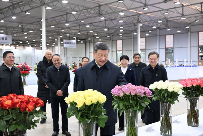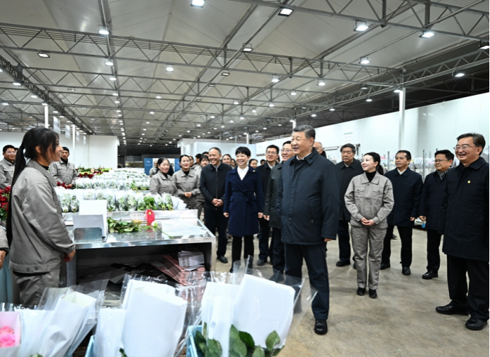 19日下午,习近平来到丽江现代花卉产业园。在展厅,他察看玫瑰、马蹄莲鲜切花品种展示,听取云南花卉产业发展情况介绍。在玫瑰花种植区,他了解智能温室无土栽培技术,同现场村民、技术人员亲切交谈。他还来到玫瑰花分级包装生产线,察看筛选、分级到包装、发货的全流程,对鲜切花通过物流及时外销表示肯定。习近平指出,云南花卉产业前景广阔,要着眼全产业链,从种业端、种植端、市场端不断深耕细作,让这一“美丽产业”成为造福群众的“幸福产业”。