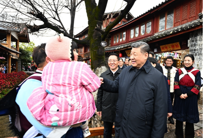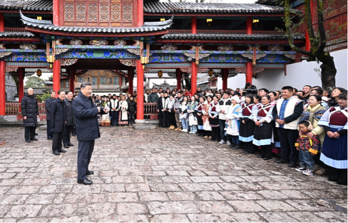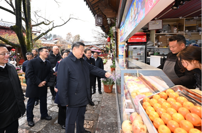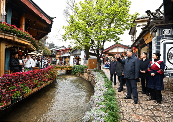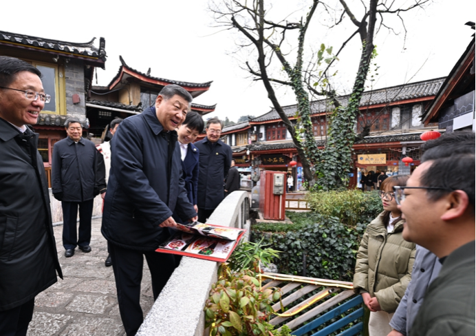 丽江古城有800多年历史,被列入世界文化遗产名录。一场春雪过后,丽江游人如织。习近平来到这里,详细了解古城营建历史、纳西族民居特色和当地文化遗产保护利用、推动文旅融合发展等情况。居民和游客见到总书记十分兴奋,争相问好,有的还弹奏乐器、载歌载舞欢迎总书记。习近平频频与大家互动交流,了解商铺经营状况和游客感受。他要求当地处理好保护和发展的关系,让这座美丽的古城焕发新的光彩。