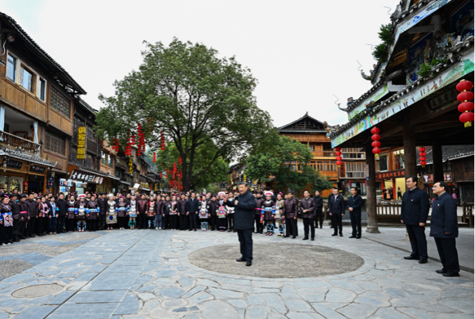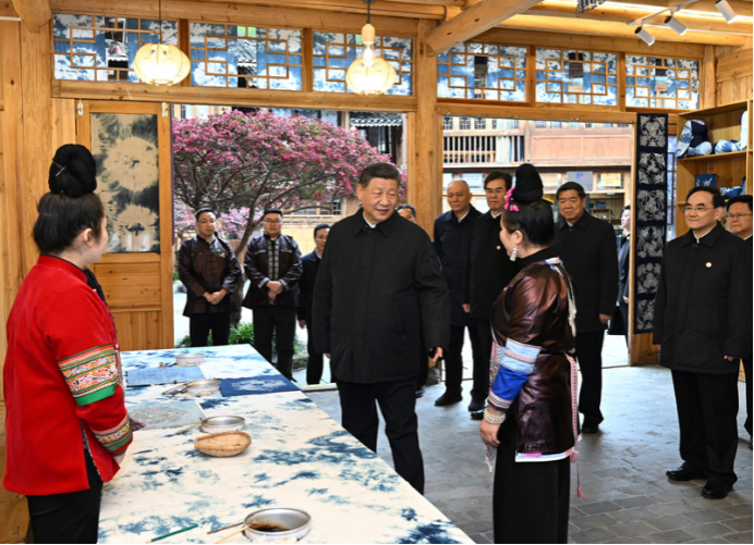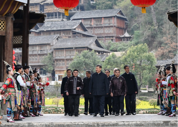 3月17日至18日,中共中央总书记、国家主席、中央军委主席习近平在贵州考察。这是17日下午,习近平在黔东南州黎平县肇兴侗寨侗乡特色产业基地考察。