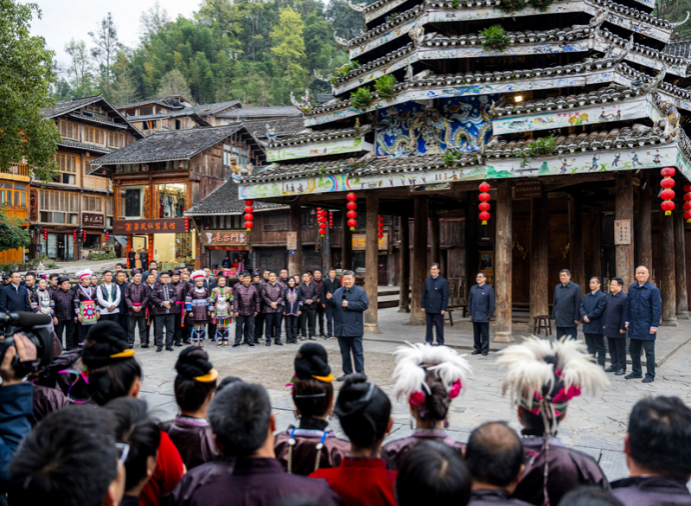 从鼓楼起身,村民们纷纷簇拥过来,热烈鼓掌,高声向总书记问好。习近平高兴地回应说,侗族人民朴实、勤劳、有文化、有智慧,希望大家在中国式现代化进程中把乡村振兴搞得更好,祝愿大家的日子越过越红火。离开侗寨时,侗族群众深情地唱起《侗歌声声唱给党》,表达对总书记的热爱和依依不舍。习近平频频挥手,同乡亲们道别。