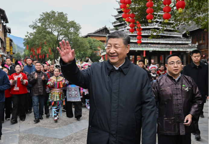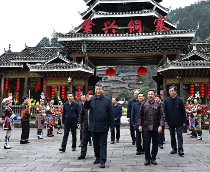 3月17日至18日,中共中央总书记、国家主席、中央军委主席习近平在贵州考察。这是17日下午,习近平在黔东南州黎平县肇兴侗寨考察时,在寨门口向身着民族盛装欢迎的村民挥手致意。