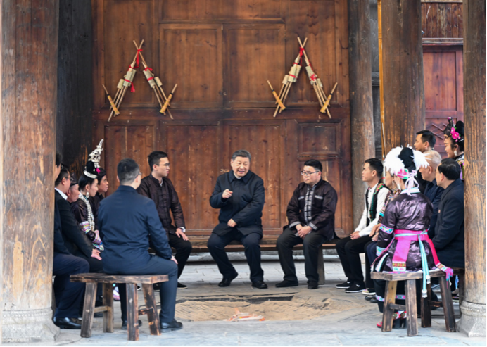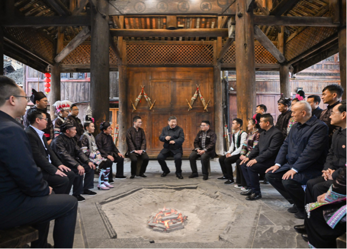 3月17日至18日,中共中央总书记、国家主席、中央军委主席习近平在贵州考察。这是17日下午,习近平在黔东南州黎平县肇兴侗寨考察时,在信团鼓楼同村干部和村民代表围坐在火塘边,共话乡村全面振兴。