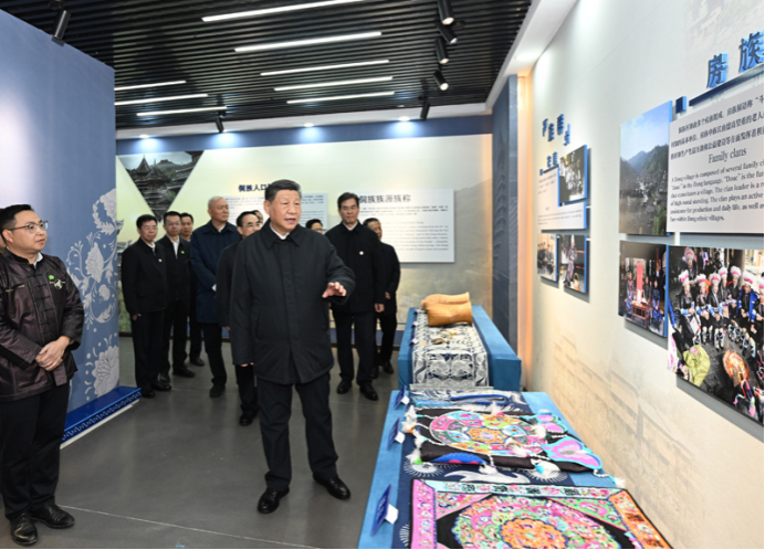 3月17日至18日,中共中央总书记、国家主席、中央军委主席习近平在贵州考察。这是17日下午,习近平在黔东南州黎平县肇兴侗寨侗族文化展示中心考察。