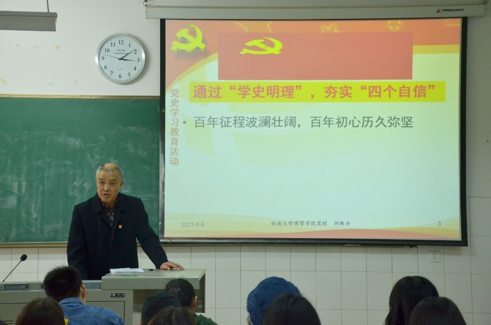 刘维全同志以“通过‘学史明理’,夯实‘四个自信’”为题为商贸学院学生第一党支部全体党员讲了专题党课,他以时间为线索,回顾了中国共产党百年来开天辟地、改天换地、翻天覆地、惊天动地的伟业,阐明中国共产党为什么“能”、马克思主义为什么“行”、中国特色社会主义为什么“好”,激励党员同志加强党性修养,作出突出贡献,不辜负党、人民和时代的期望。
