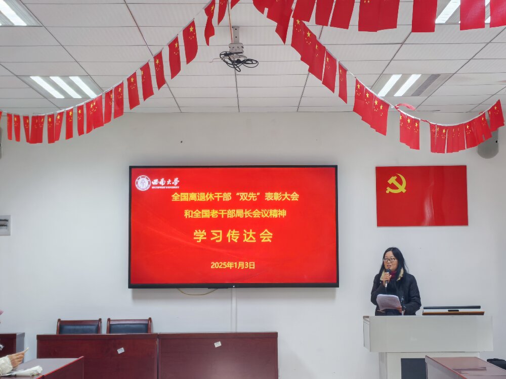 1月3日,召开离退休老干部代表专题学习会,会上,离退休党委书记李红传达了会议精神,号召大家向受表彰的离退休干部先进集体和先进个人学习,弘扬光荣传统、永葆政治本色,继续为国家建设和学校事业发展贡献智慧力量。