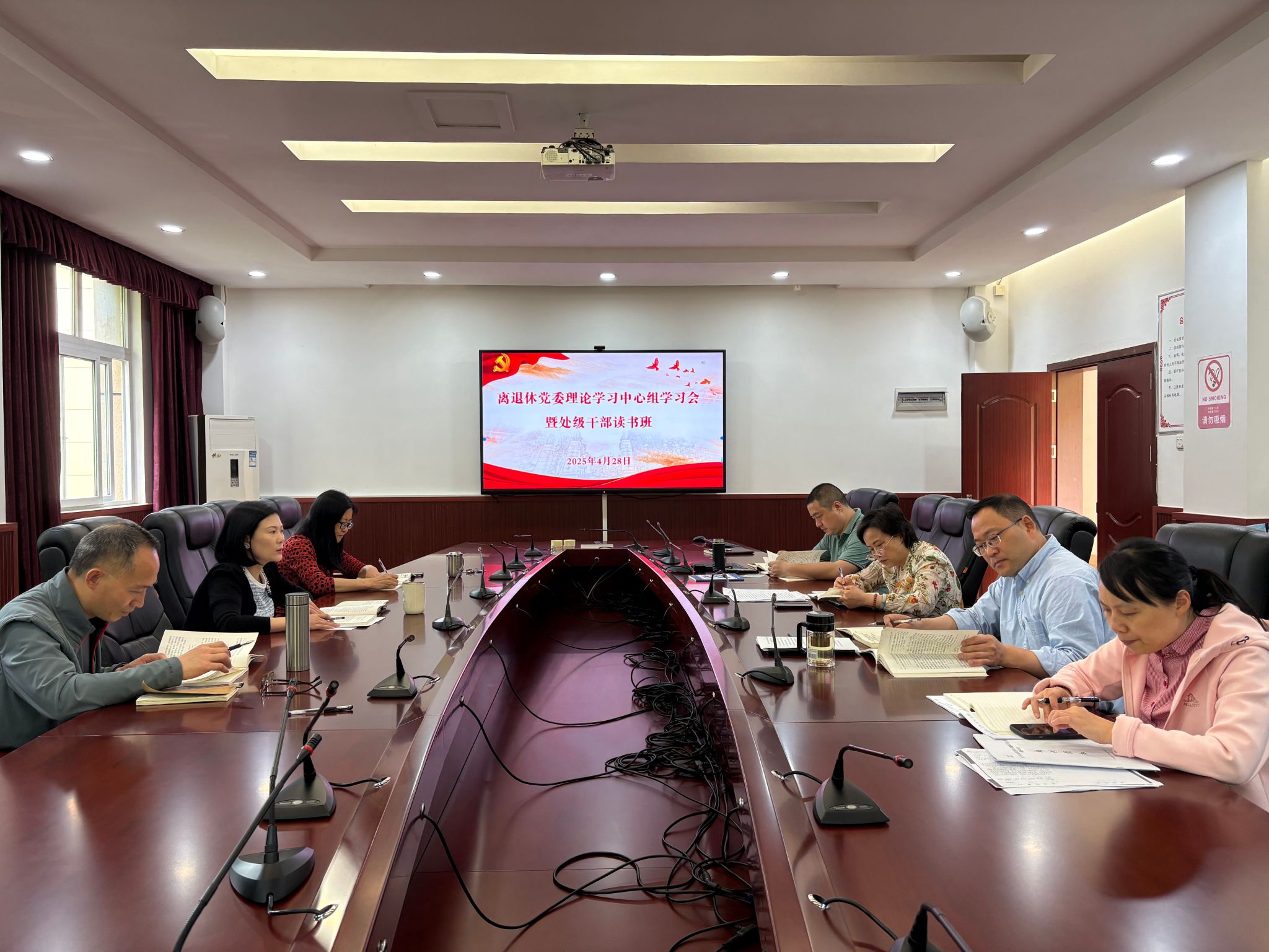 4月28日上午,离退休党委在桃花山离退休教职工活动中心307会议室举行了2025年第二次党委理论学习中心组学习会暨处级干部读书班,全体班子成员参加学习会。会议由离退休党委书记余小蓉主持。