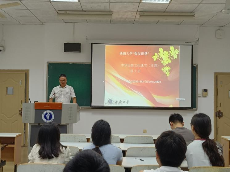 6月6日,学校关工委副秘书长、“西大红”五老服务团引航服务部部长周大明做客“银发讲堂”,以“中华民族文化瑰宝(非遗)”为主题,为青年学子带来一场穿越时空的文化盛宴。