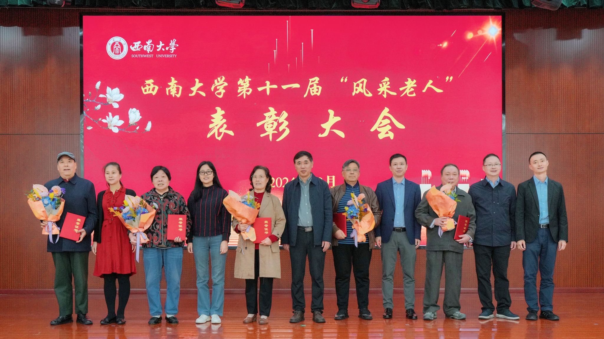 会上,离退休党委书记李红宣读《西南大学关于表彰第十一届 “风采老人” 的决定》,与会领导为受表彰的老同志颁发荣誉证书。“风采老人”代表、文学院退休教师李达武发表感言,用《越人歌》《步出夏门行·龟虽寿》等经典诗词表达对祖国的深情热爱和诚挚祝福,号召广大离退休教职工围绕教育强国建设,聚情、聚智、聚力,为推动学校高质量发展续添正能量,再作新贡献。