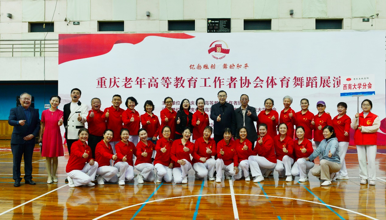 11月4日,重庆老年高等教育工作者协会以“纪念胜利、舞动和平”为主题,在重庆大学举办纪念中国人民抗日战争暨世界反法西斯战争胜利80周年体育舞蹈展演。由25名高教老协会员组成的西南大学分会代表队和来自全市各高校分会的老年教育工作者齐聚一堂,用舞姿传承抗战精神,展现健康昂扬的晚年风貌。高教老协西南大学分会会长、原西南大学党委副书记徐晓黎应邀出席,西南大学离退休党委书记余小蓉陪同参加。